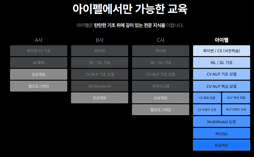 개인적으로 가장 매력적으로 다가왔던 부분은 커리큘럼이다. 인공지능 리서치 관련하여 자세하게 다루는 부트 캠프는 많이 없기도 하고, 특히 논문과 연구 중심으로 공부할 수 있어서 나의 진로에 있어 가장 이상적인 커리큘럼이라고 생각했다.
