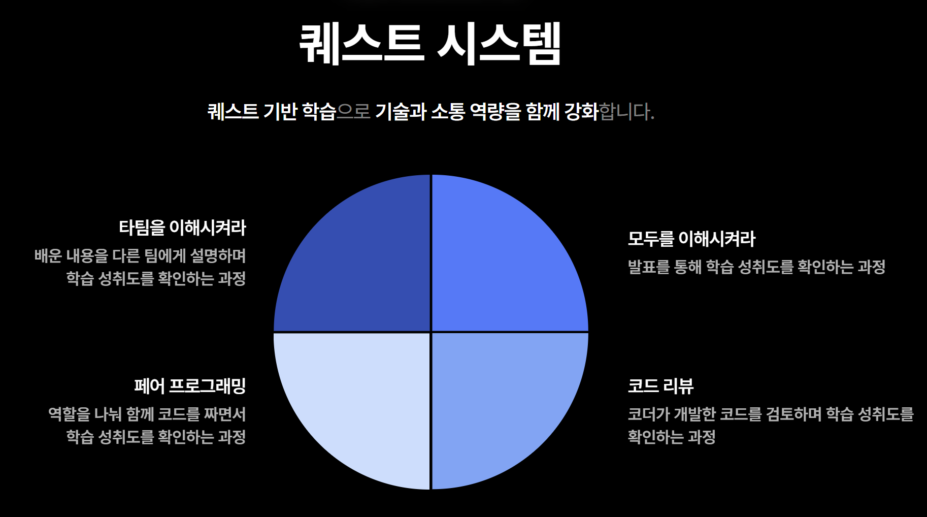 아직 티칭 팀이 된 적은 없지만 배운 내용을 바탕으로 다른 팀에게 해당 내용을 가르치면서, 나 스스로 무언가를 해내고자 하는 역량이 길러지는 것 같다. 예전에는 이해 잘 못하고 넘어간 개념들도 교육 받으면서 다시 보니 이해가 되기도 하고 신기했다.