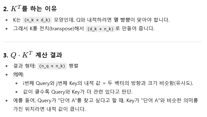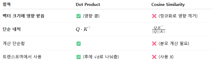 사실 왜 T일까 궁금했는데 알고보니 n_k x d_k의 형태라 전치하여 d_k x n_k로 만드는 것이었다. 그리고 해당 값은 쿼리와 키 벡터 간의 내적 값이며, 이 값이 클 수록 둘은 방향이 비슷하고 의미적으로 관련이 있다고 볼 수 있다. 코사인 유사도와 원리는 비슷하지만 계산 효율성과 단순화를 위해 트랜스포머에서는 Dot Product를 사용한다고 한다.