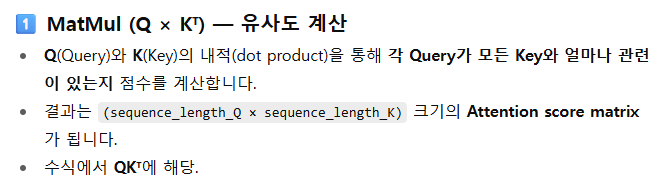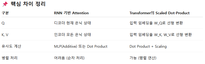 Scaled Dot Product는 트랜스포머에서 사용되는 어텐션 방식으로, Q, K, V는 모두 동일한 토큰 임베딩에서 선형 변환으로 생성된다. SoftMax와 V 곱까지 행렬 단위로 병렬 계산이 가능하다는 차이점이 존재한다.