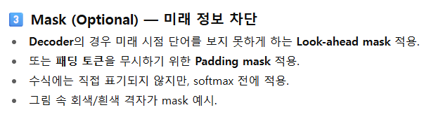 Mask는 디코더에서만 사용되는데, 다음 단어를 예측할 때 미래 단어를 보지 못하게 하는 Look Ahead Mask를 적용한다. 또는 패딩 토큰을 무시하기 위한 패딩 마스크를 적용하기도 한다.