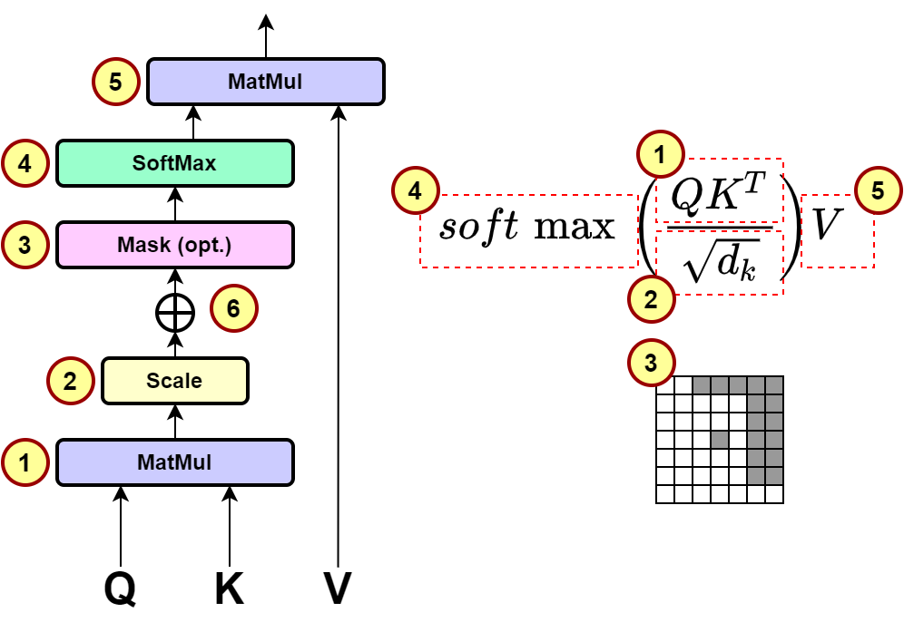 위의 그림은 Scaled Dot Product Attention의 계산 과정을 나타낸 것이다. 가장 처음 MatMul에서는 Q가 K에 얼마나 주의를 기울일지 Dot Product를 이용하여 계산한다.