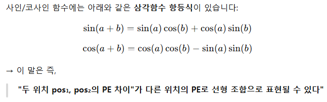 - 절대 위치 Positional Encoding을 사용했다고 하더라도, sin, cos 함수로 구성되어 있다면 그 값에 주기성과 선형성이 있으므로, 두 위치 차이를 포함한 정보를 학습할 수 있다.