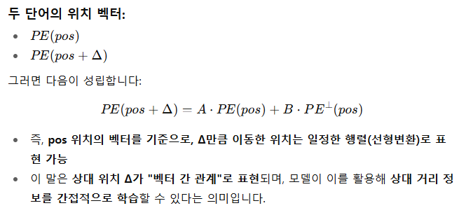 3. Positional Encoding은 상대 위치 간의 선형 관계를 모델이 학습할 수 있는 형태여야 한다.