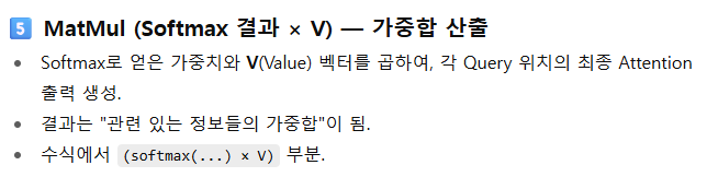 마지막으로 MatMul에서 SoftMax 확률을 Value 벡터에 곱해서 문맥 정보를 반영한 새로운 표현 벡터를 생성한다. 관련 있는 정보들의 가중 합이 결과로 나온다. 여기서는 단순하게 Scaled Dot Product를 했지만 residual 연결이나, bias 추가 등의 연산을 추가로 적용할 수 있다.