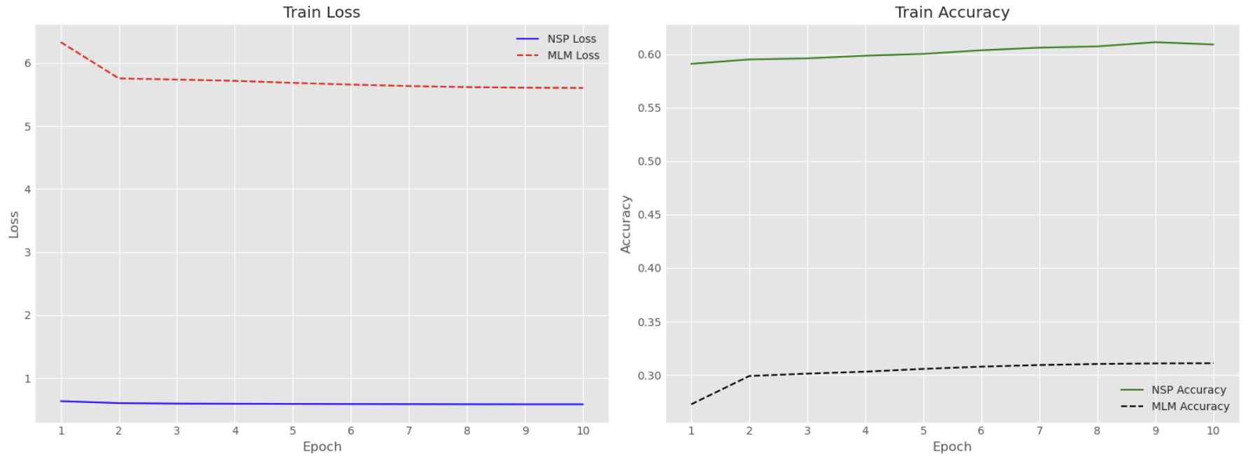 현재의 학습률(1e-4)과 낮은 Epoch(10)로 인해 모델이 적절히 학습하지 못하여 최적의 성능을 못 내는 것이 아닐까 가설을 세웠다. 학습률을 2e-4, 3e-4로 순차적으로 상향하고, 학습 시간을 30 Epochs로 대폭 늘려서 성능 변화를 관찰했다. Epoch를 10으로 고정하니, 아무리 학습률이 증가해도 정확도 향상 속도가 느려서 마지막에는 Epoch를 3배 증가했다. 결국 학습률을 3e-4로 높이고 학습 시간을 30 Epochs로 늘렸을 때 NSP 정확도가 약 9% 증가했다.