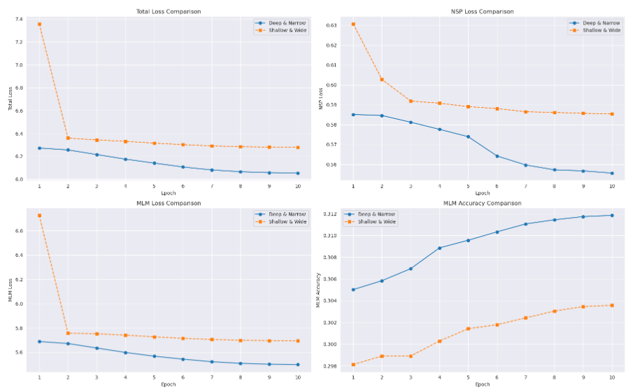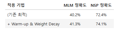 MLM은 34.0%, NSP는 61.5%의 정확도를 보였는데, 기본적인 언어 패턴 학습을 시작했다는 것을 보여주지만, 성능 곡선이 epoch 10 시점에서도 계속 상승 중인 것을 확인하여 아직 학습이 충분히 진행되지 않았다는 것을 알았다. 여기서 하이퍼 파라미터를 조정해보면 좋을 것 같다는 생각이 들긴 했으나, 무작정 바꾸기보다는 근거를 바탕으로 실험을 진행하는 것이 맞다고 판단했다.